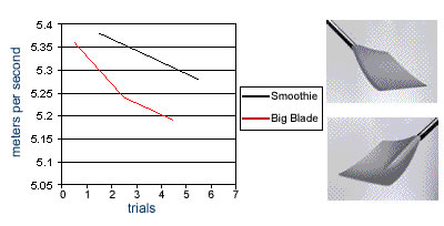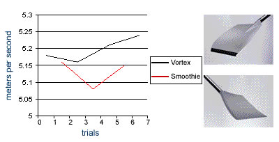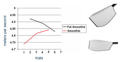 This test was to investigate what efficiencies could be gained by using a wider blade. The Fat2 blade is about 2 cm wider, the additional surface area specifically intended to target improved efficiencies during the third phase of the stroke. The Fat2 blade also features a Vortex Edge.