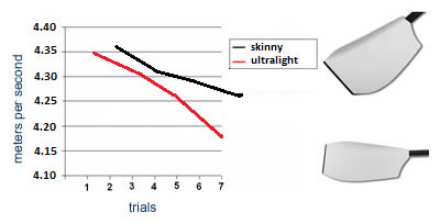 This test, done by a single sculler, compared results using the same Fat2 blades on Skinny and Ultralight shafts. Speeds for pieces with the Skinny shaft are consistently faster. During the test a slight headwind developed, which is not ideal for a test day, but the larger difference in speed at the end of the test is a possible indication that the decreased wind drag of the Skinny shaft contributed to the speed advantage.