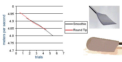The following graphs the speeds of the test pieces. The round tip is red; the Smoothie1 is black. The speed of these two designs was the same in our tests; however, the feel of the oar was greatly changed by the tip profile. With the rounded profile, the oar was rowed one centimeter shorter and still felt like a heavier load during phase 2. This would suggest improved efficiency in phase 2. The lack of a speed increase may be due to a decreased effectiveness in other parts of the stroke, perhaps phases 1 and 3.