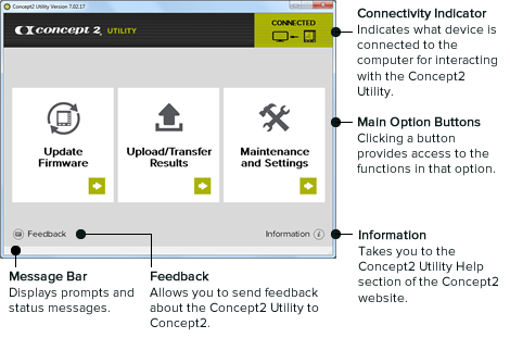 User Interface Overview Connecting Devices Connecting a PM3, PM4 or PM5 to Your Computer Inserting a USB Flash Drive Uploading/Transferring Results Uploading Results to an Online Logbook Working with the List of Results Setting Machine Type and Weight Class Defaults Transferring Results to a Spreadsheet Updating Firmware Updating Firmware Concept2 Utility User Interface Overview