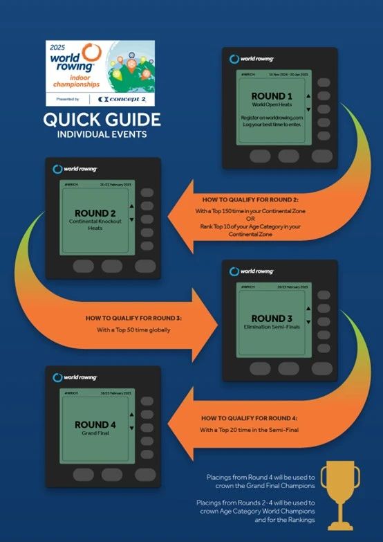 WRICH从资格赛开始,对所有人开放。比赛类别包括500米冲刺、2000米长距离项目,以及新增的耐力接力赛和短跑接力赛项目。参赛者可以在2025年1月20日之前通过世界划船报名网站提交所选项目的成绩。