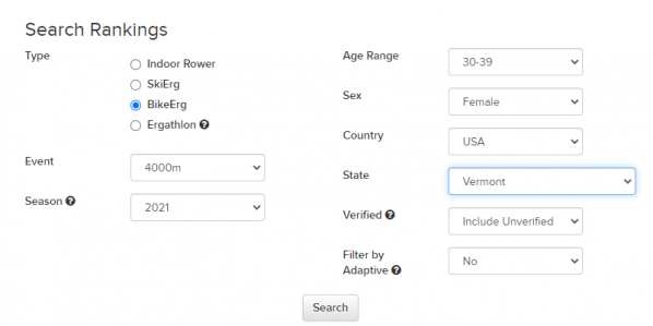 woman on rowergFor those who haven’t discovered it yet, the Concept2 Online Ranking is a very large and constantly growing database of best times for twelve different distance/time pieces on the RowErg, SkiErg and BikeErg. Its thousands of entries from users around the world can be readily sorted by event, age group, gender, weight class, country, state, adaptive category and more. The online ranking can be a very useful resource and training tool, even if you never choose to post a PR and rank yourself.